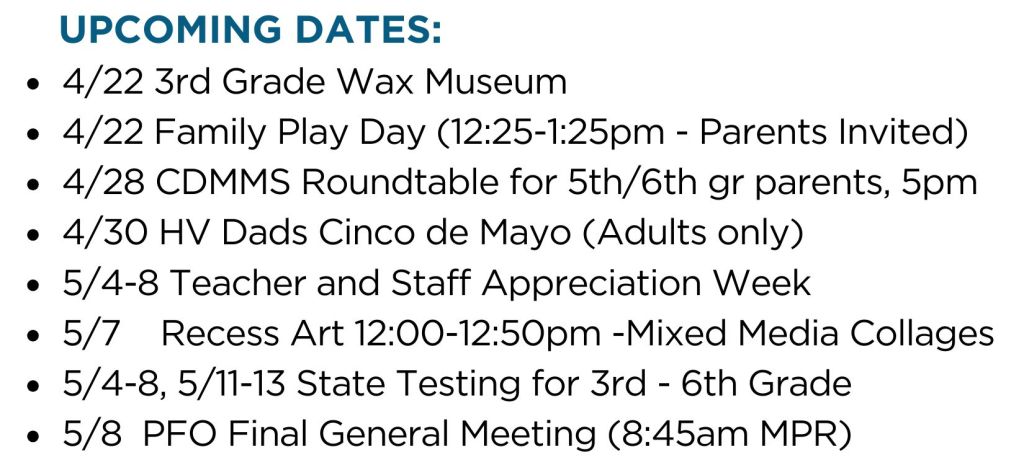 Thanks to your generous donations to the HVPFO and in collaboration with Recess Art, we will be continuing our drop-in Art Workshops for all students, TK through 6th Grade during lunch recess. Please sign up to volunteer here.