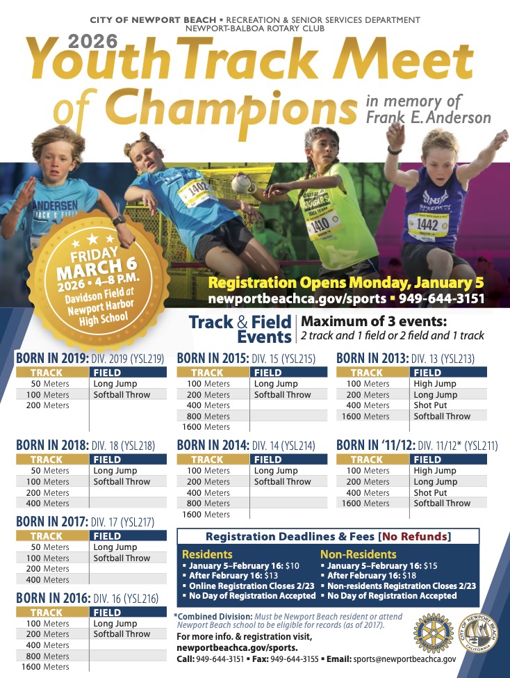 HVE track members will be encouraged to register and participate in the Newport Beach Youth Track Meet of the Champions held on March 6.